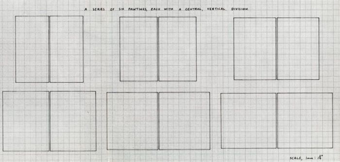 3-Fold card for Alan Charlton’s exhibtition A Series of Six Paintings, Each With A Central, Vertical, Division at Konrad Fischer Gallery, Düsseldorf, 1975.