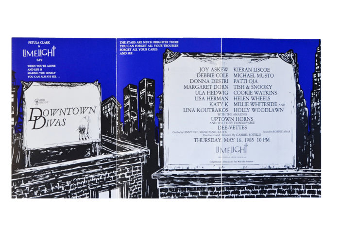 Small folded poster for Downtown Divas, a party at Limelight in 1985. IncludedCookie Watkins, Helen Wheels, with the Uptown Horns and Dee-Vettes. Hosted by Petula Clark