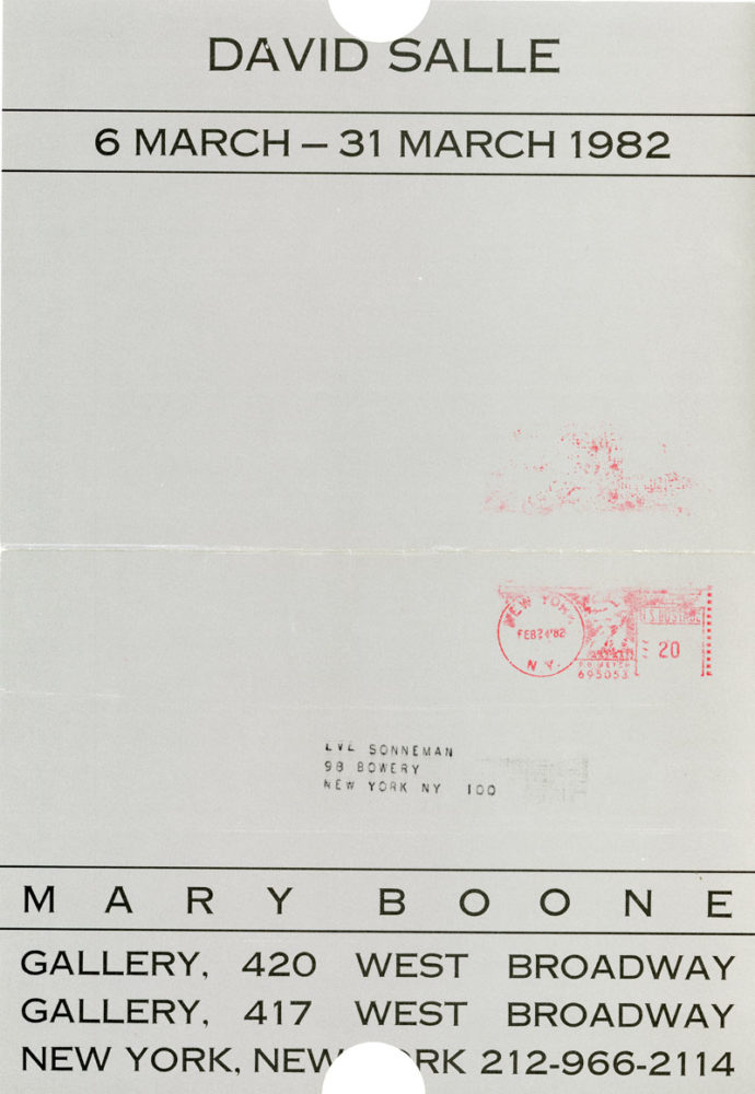 Folded card for David Salle’s exhibition at Mary Boone Gallery, 1982.  Inside of card features Salle’s The Old, The New, and The Different, 1981. Although the Boone gallery is the only one listed, this exhibition happened in tandem with an exhibition of Salle’s work at Leo Castelli Gallery.
