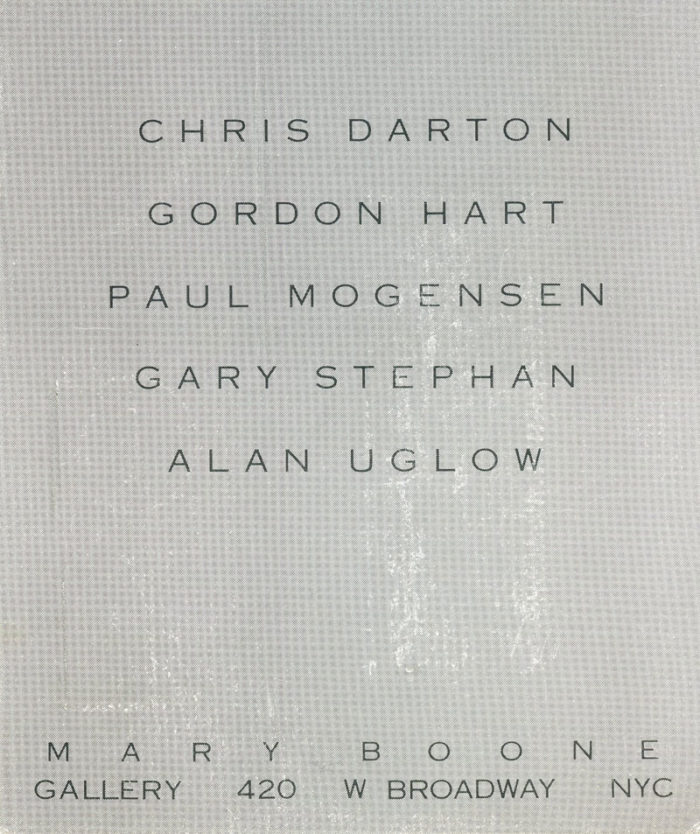 Card for a very early group show at Mary Boone Gallery, January 1978. Artists include Chris Darton, Gordon Hart, Paul Mogensen, Gary Stephan and Alan Uglow.
