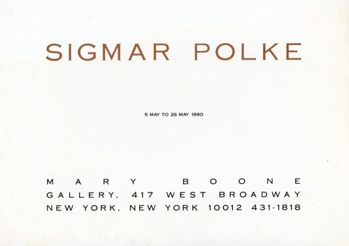 Folded card for Sigmar Polke’s exhibition at Mary Boone Gallery, 1990. Front of card features Polke’s Untitled, 1990.