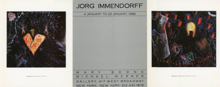 Large oversized 3-fold announcement card for Jörg Immendorff’s second exhibition at Mary Boone Michel Werner Gallery, 1986. Features 5 large color reproductions of Immendorff’s works.