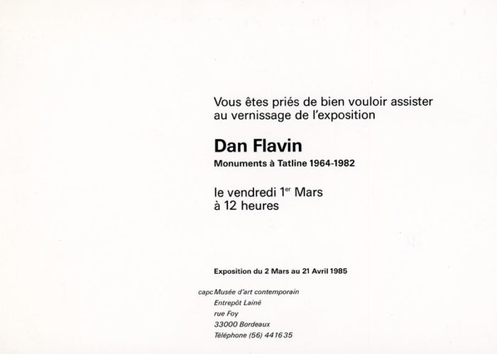 Card for Dan Flavin’s exhibition Monuments á Tatline at Musée d’art Contemporain, France, March 2 – April 21, 1985