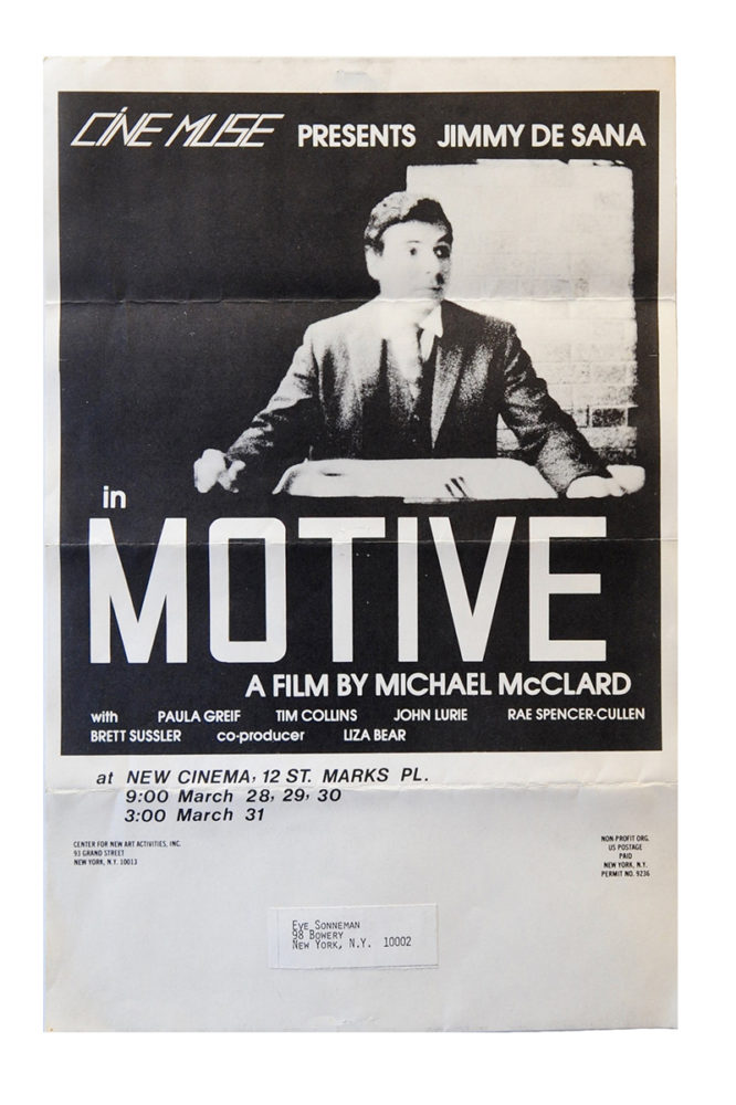Folded mailer poster for Michael McClard’s Motive, a film starring Jimmy de Sana, screening at New Cinema.