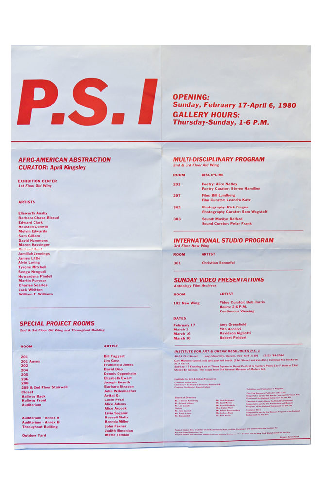 Folded events poster for P.S. 1, February – April, 1980. Includes an exhibition, Afro-American Abstraction, curated at April Kingsley with Sam Gilliam, David Hammons, Martin Puryear, and Jack Whitten.