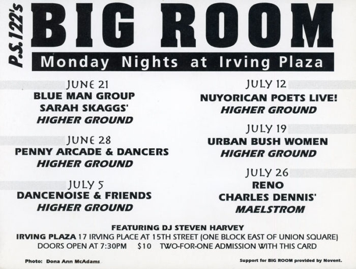 Card for P.S. 122’s Big Room: Monday Nights at Irving Plaza, c. 1990’s. Card features a photo by Dona Ann McAdams, and programming for June and July, including performance by Penny Arcade, the Blue Man Group, Nuyorican Poets Live and others.