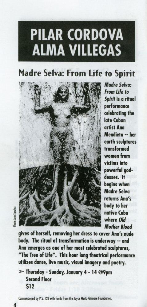 Events Calendar Brochure for P.S 122’s winter season, January – March 1996. Included performance Madre Selva: From Life to Spirit which celebrated the life of artist Ana Mendieta. Performance by Pilar Cordova and Alma Villegas.