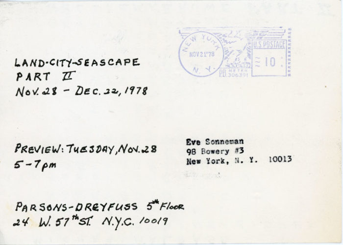 Card for group show Land-City-Seascape Part II at Parsons-Dreyfuss, 1978.