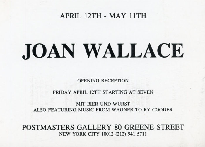 Card for Joan Wallace’s exhibition at Postmasters Gallery, 1991.