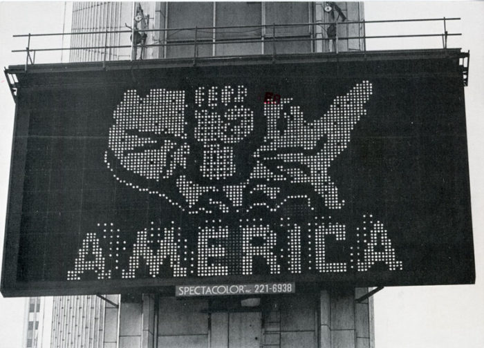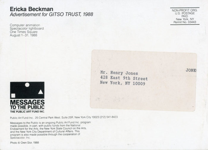 Postcard for Ericka Beckman’s Advertisement for GITSO TRUST spectacolor lightboard installation with Public Art Fund, 1988. Photo by Oren Slor.