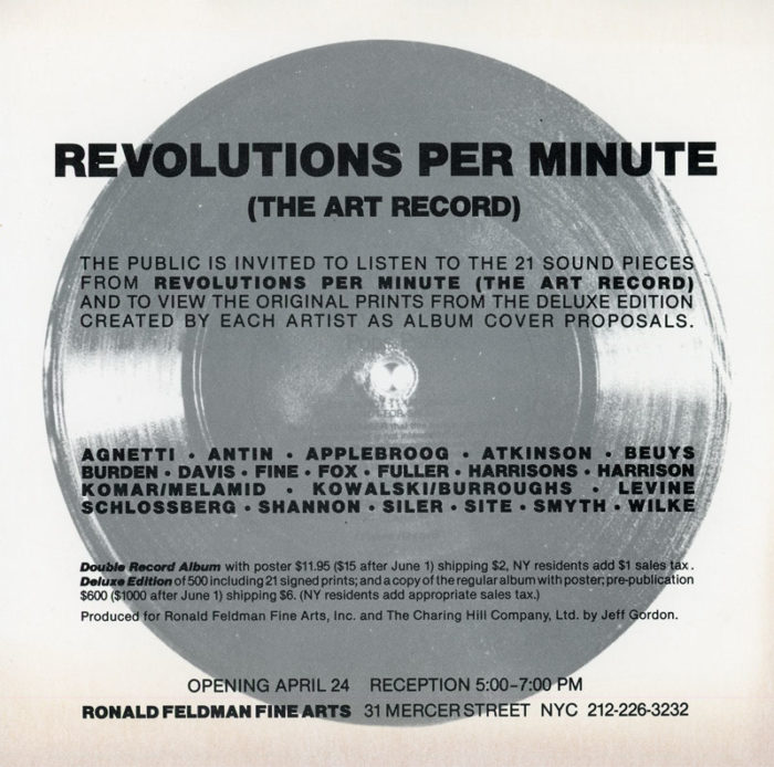 Ronald Feldman Fine Arts, Antin, Applebroog, Beuys, Wilke…, Revolutions Per Minute (The Art Record), Card, 1982