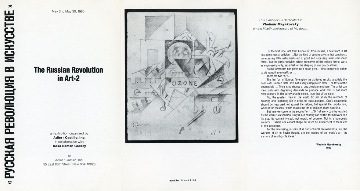 Folded card for The Russian Revolution in Art – 3, an exhibition of Russian art at Roas Esman Gallery in collaboration with Alder/Castillo, 1981. Front of card features Liubov Popova’s Untitled, 1920. Other participating artists included Alexandra Exter, Ivan Kliun, Kazimir Malevich, Mikhail Matiushin and others.