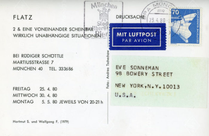 Postcard for an exhibition by the artist group FLATZ, made up of Hartmut S. and Wolfgang F., at Rüdiger Schöttle Gallery, 1980.