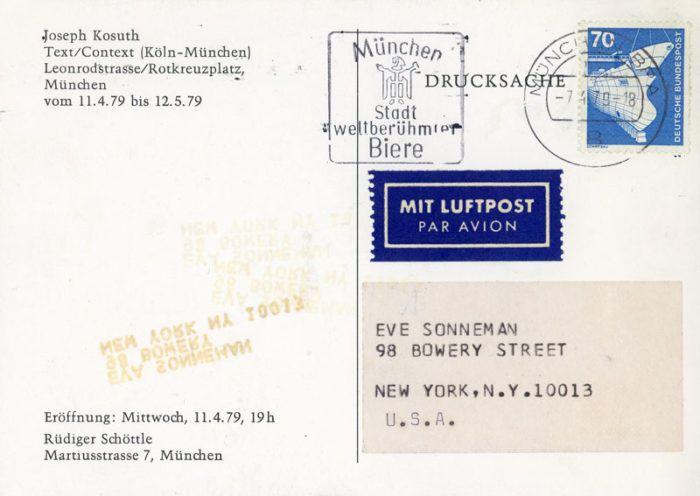 Postcard for Joseph Kosuth’s exhibition Text/Context (Köln-München) at Rüdiger Schöttle Gallery, 1979.
