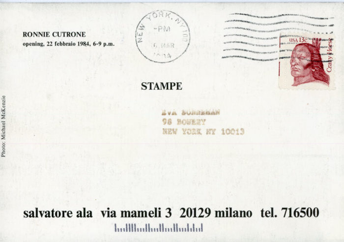 Postcard for Ronnie Cutrone’s exhibition at Salvatore Ala, Milan, 1984.