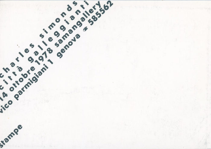 Postcard for an exhibition with Charles Simonds and Cittá Galleggianti at Saman Gallery, Genova, 1978.