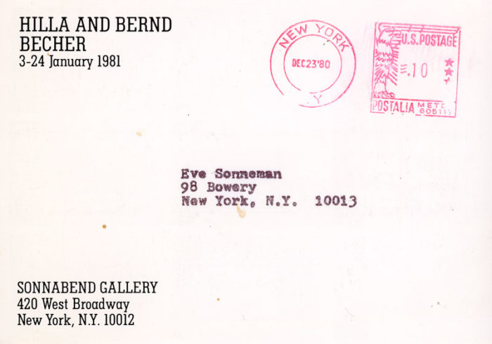 Postcard for hilla and Bernd Becher’s exhibition at Sonnabend Gallery, 1981.