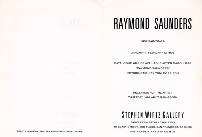 Folded card for Raymond Saunders’ New Paintings at Stephen Wirtz Gallery, 1993. Front of card features Wirtz’s Beauty is Syntax, 1992.