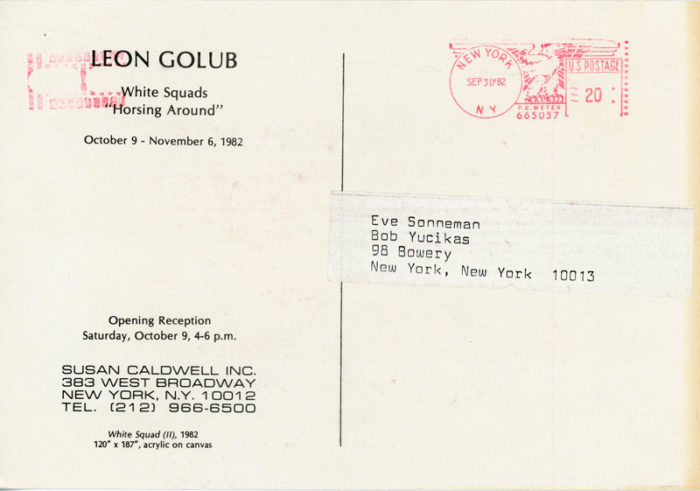 Postcard for Leon Golub’s exhibition, White Squads “Horsing Around”, at Susan Caldwell Inc., 1982.