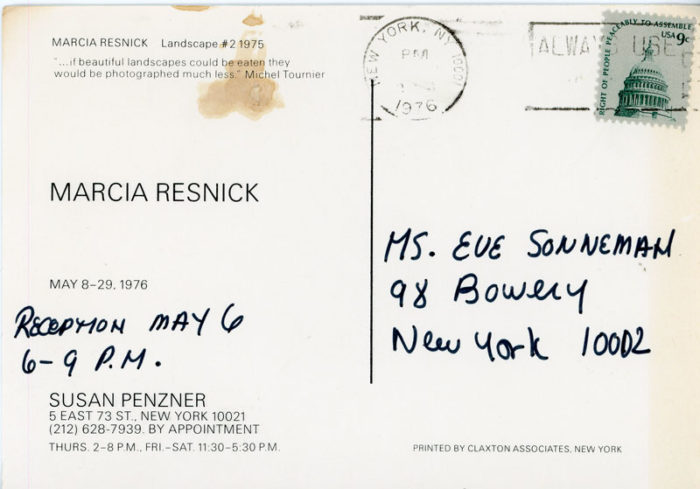 Postcard for Marcia Resnick’s exhibition at Susan Penzner Gallery, 1976. Front of card features Resnick’s Landscape #2, 1975.