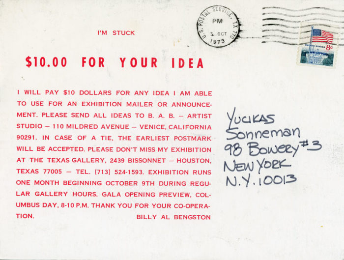 Postcard advertising Billy Al Bengston’s exhibition at Texas Gallery, Houston, 1973. In the card, he asks for idea submissions for the exhibition’s mailer, along with a finders fee.