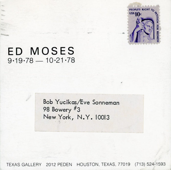 Card for Ed Moses exhibition at the Texas Gallery, 1978.