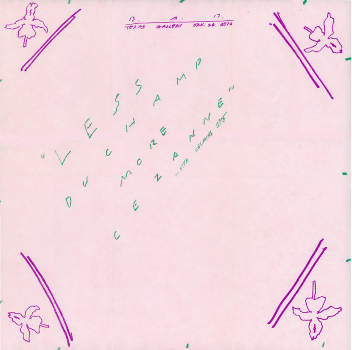 Folded announcement on tissue paper for Billy Al Bengston’s exhibition at the Texas Gallery, 1976. Announcement features Celmins’ famous quote, ‘Less Duchamp more Cezanne’.