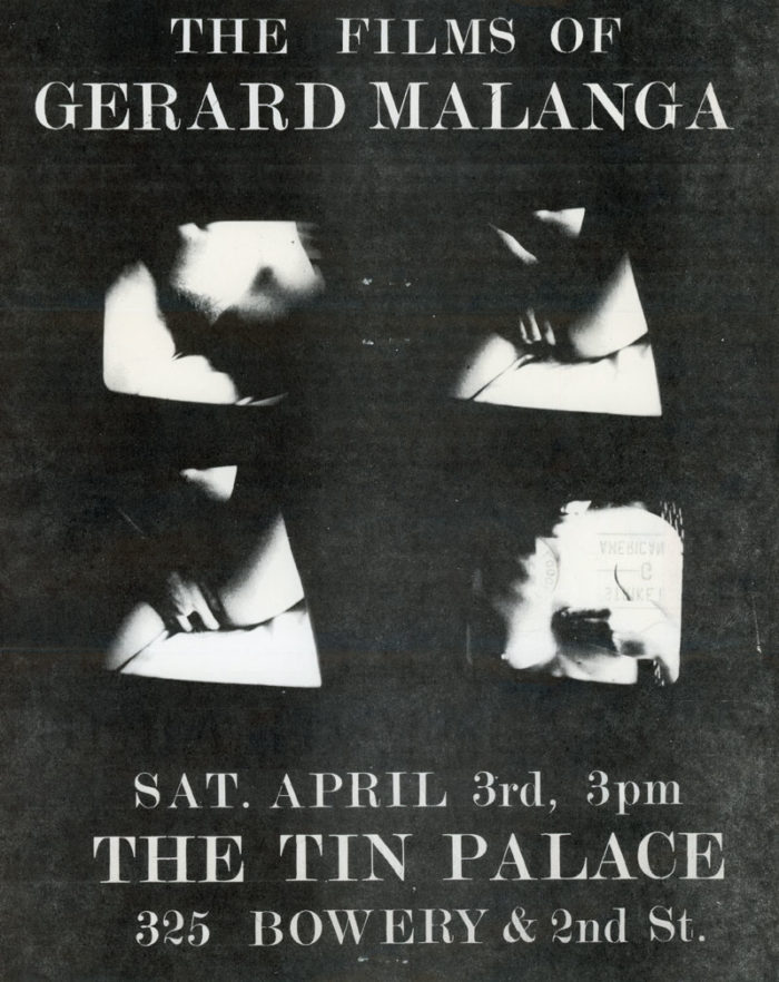 Flyer for a film screening for The Films of Gerard Malanga, The Tin Palace, 1976.