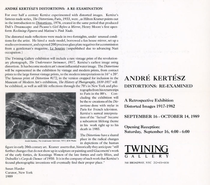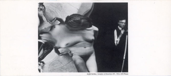 Folded card for André Kertész’s Distortions: Re-Examined at Twining Gallery, 1989. Front of card features Kertész’s Variation of Distortion #91, 1933.