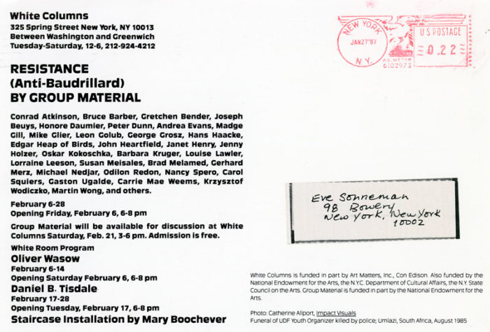 Group Show with Martin Wong, Hans Haacke, Jenny Holzer, Resistance (Anti-Baudrillard), Card, White Columns, 1987