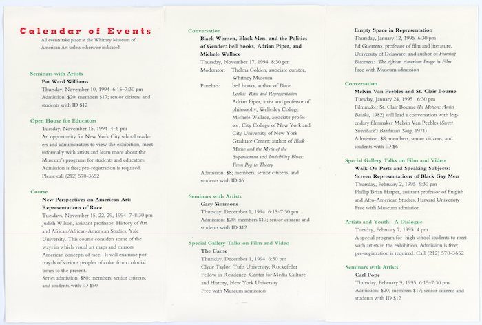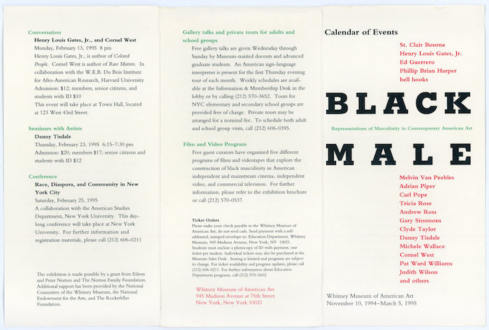 Handout for events connected to the exhibition Black Male Representations of Masculinity in Contemporary American Art at the Whitney Museum, November 1994 – March 1995. Participants include Henry Louis Gates Jr., Adrian Piper, Melvin Van Peebles, Cornel West, and exhibition curator Thelma Golden.