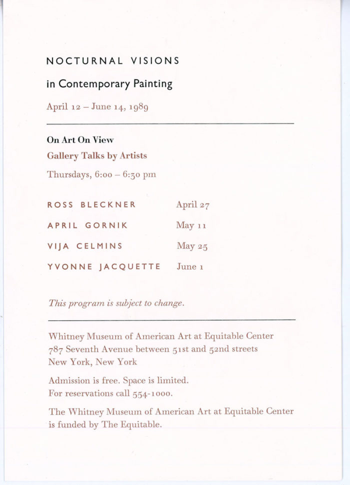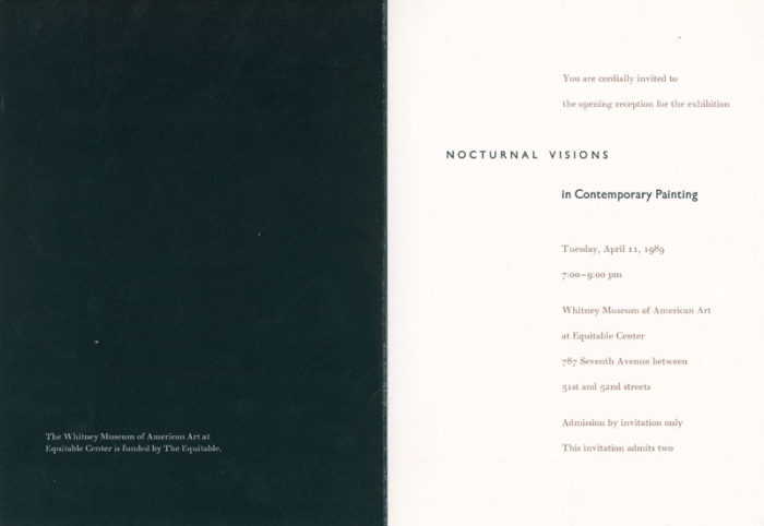 Folded card with insert for Nocturnal Visions in Contemporary Paintings, an exhibition at the Whitney Museum of American Art, 1989. Exhibition featured work by Eric Fischl, Ross Bleckner, April Gornik, Vija Celmins and others.  Front of card features Fischl’s Best Western, 1983.