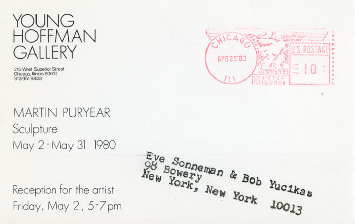 Postcard for Martin Puryear’s exhibition of Sculpture at Young Hoffman Gallery, Chicago, 1980.