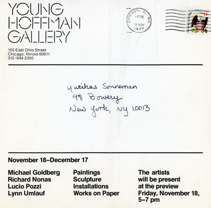 Postcard for a group show with Michael Goldberg, Richard Nonas, Lucio Pozzi & Lynn Umlauf at Young Hoffman Gallery, Chicago, 1977.
