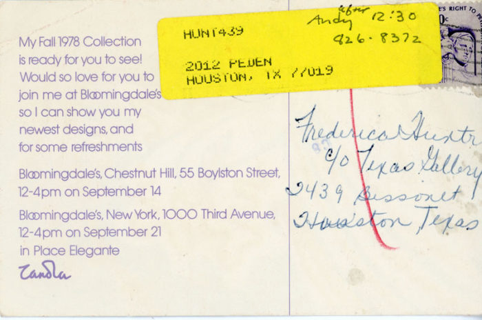 Card for the launch of Zandra Rhodes’ new fashion line collection, The Painted Lady Collection, at Bloomingdales, 1978.