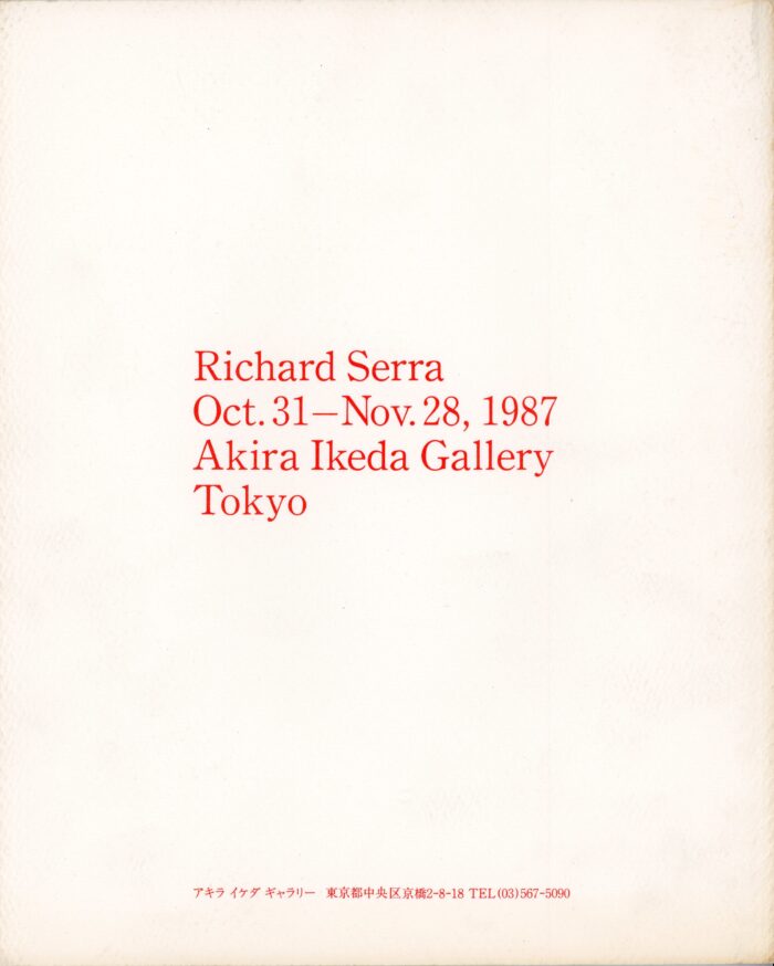 32-page catalog produced on the occasion of Richard Serra’s exhibition “Wall Props” at Akira Ikeda Gallery, Tokyo, October 31 – November 28, 1987.