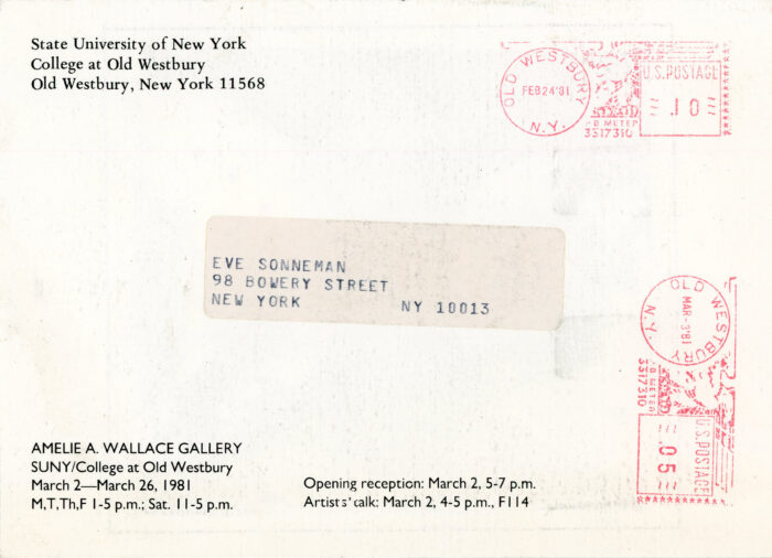 Announcement card for an exhibition by David Hammons, Charles Abramson, and Jorge Rodriguez at Amelie A. Wallace Gallery at SUNY/College at Old Westbury, March 2 – 26, 1981.