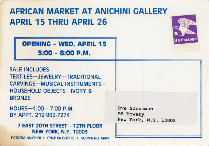 Announcement card for an “African Market” at Anichini Gallery, April 15 – 26, 1981. The flea-market style sale included textiles, jewelry, traditional carvings, musical instruments, household objects, and ivory & bronze.