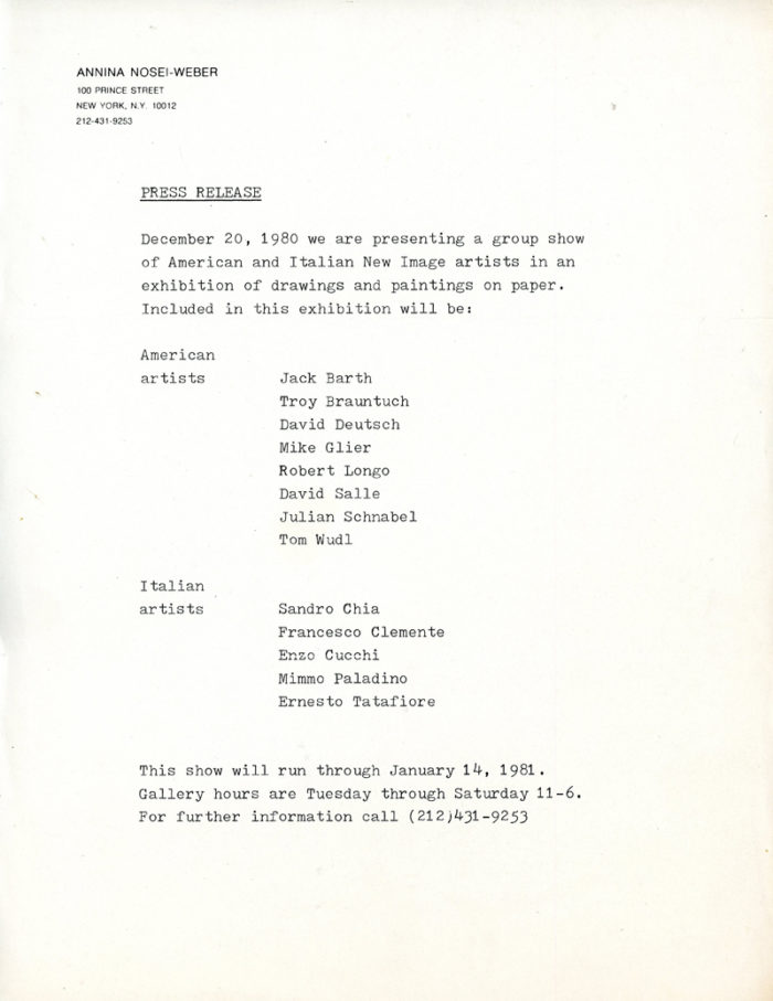 Announcement card and press release for a group show “Drawings & Paintings on Paper” at Annina Nosei Gallery, December 1980.