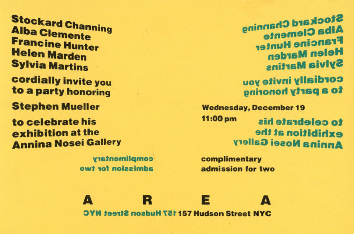 Invite card for a party at AREA celebrating Stephen Mueller’s exhibition at Annina Nosei Gallery, Wednesday December 19, 1984.