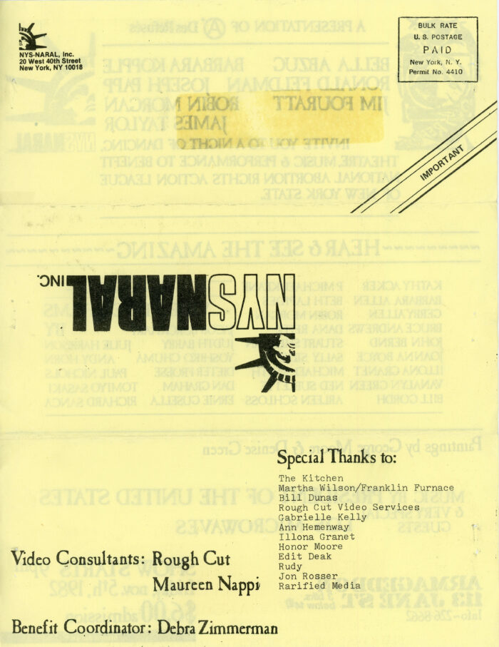 Tri-fold flyer/announcement for a presentation of Des Refusés, a night of dance, theatre, music, and performance to benefit the National Abortion Rights Action League (NARAL) at Armageddon. With Kathy Acker, Ronald Feldman, James Taylor, Jim Fouratt, Arlene Schloss, Dan Graham, and more. November 5, 1982.