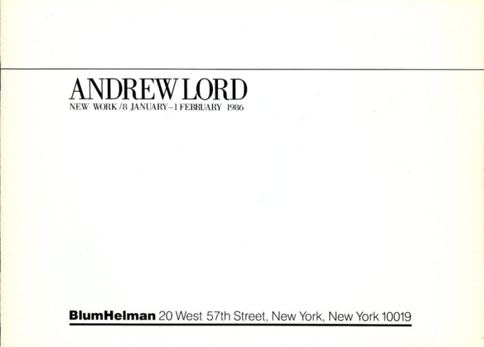 12-page catalogue for an exhibition of new work by Andrew Lord at BlumHelman Gallery, January 8 – February 1, 1986.