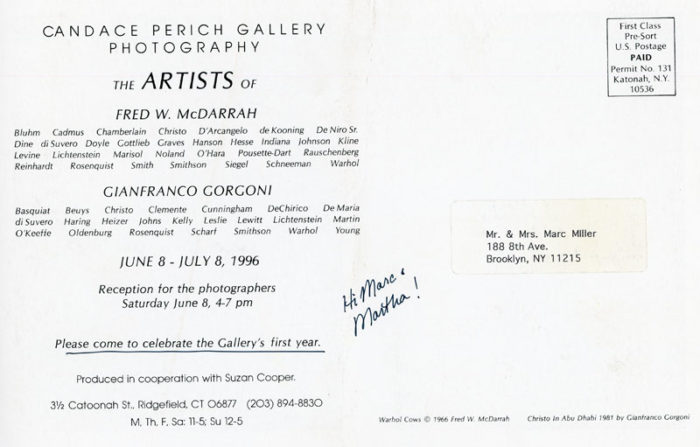 Card for an exhibition of the artist portrait photographs by Fred W. McDarrah and Gianfranco Gorgoni at Candace Perich Gallery. Front of card features McDarrah’s Warhol Cows, 1966, and Gorgoni’s Christo in Abu Dhabi, 1981.