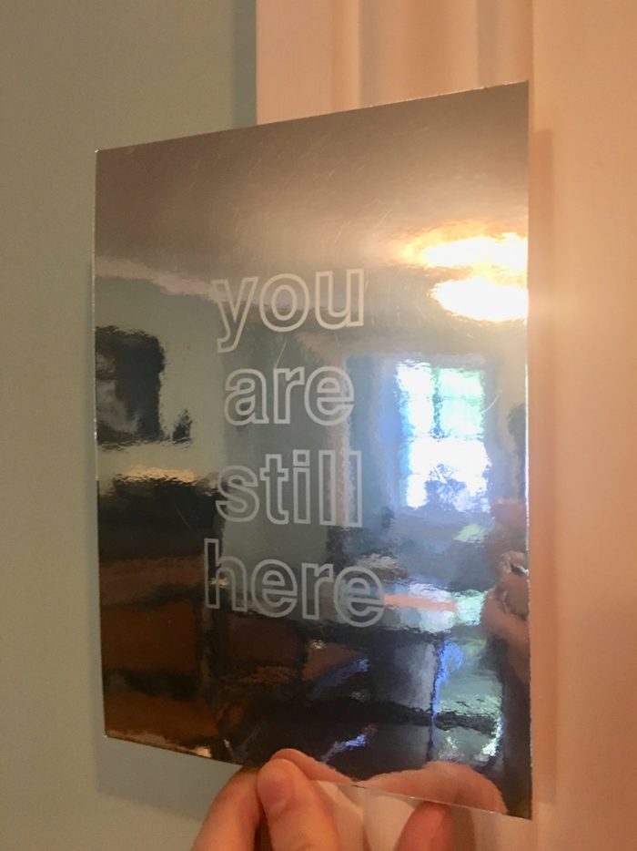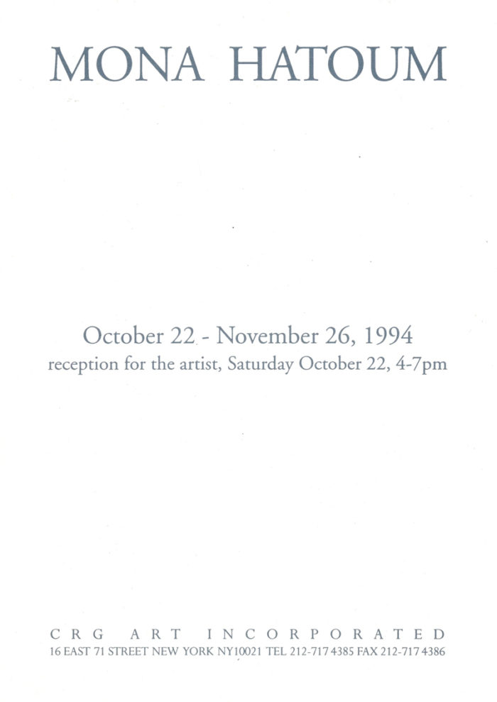 Card with reflective surface for Mona Hatoum exhibition at CRG Art Inc., October 22 – November 26 1994.