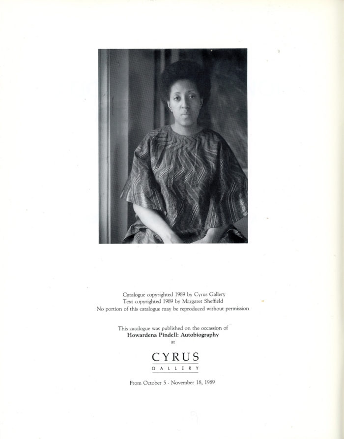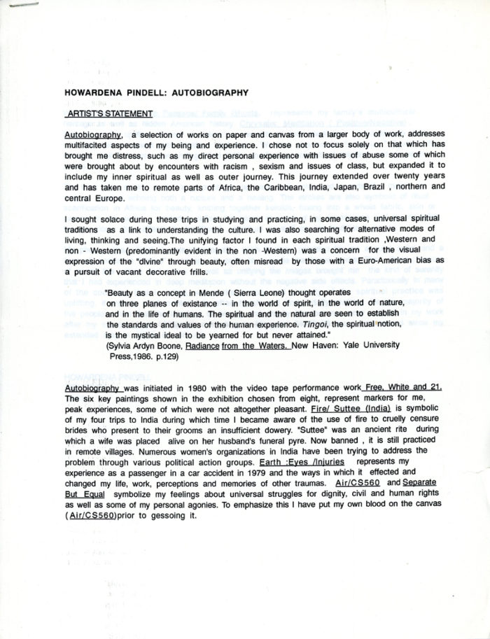 Catalogue and press release produced on the occasion of Howardena Pindell’s exhibition “Autobiography” at Cyrus Gallery, October 5 – November 18, 1989.