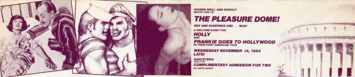 Folded invite card for The Pleasure Dome at Danceteria, hosted by Dianne Brill and Rudolf. With Holly and Frankie Goes to Hollywood, Wednesday November 14, 1984.