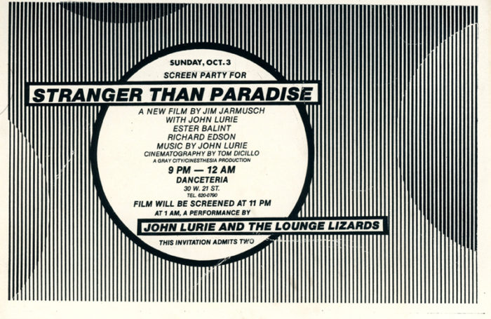 Danceteria, Jim Jarmusch, John Lurie & the Lounge Lizards, Ester Balint, Stranger Than Paradise Screening Party, Card, 1982. This screening party was for the 30 minute version of Stranger Than Paradise, which was briefly screened before the release of the feature length film in 1984.