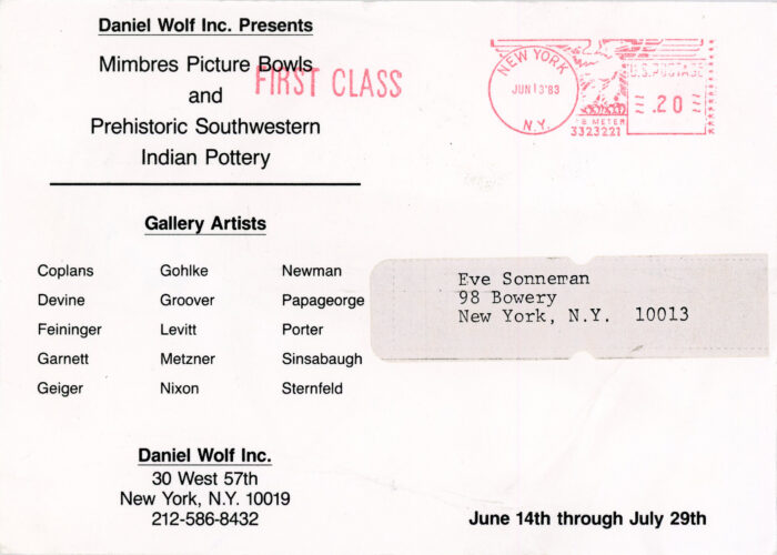 Announcement card for an exhibition of Mimbres Picture Bowls and Prehistoric Southwestern Indian Pottery at Daniel Wolf Inc., June 14 – July 29, 1983.
