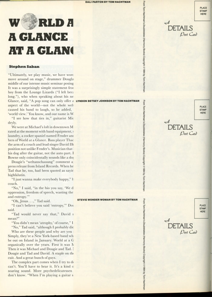 November issue of DETAILS Magazine, 1989. This issue includes an article on Bruce Weber’s Broken Noses, ad art by Keith Haring, as well as 3 tear-out postcards with art by Tom Hachtman. Issue also features Stephen Saban’s column, Marcus Leatherdale’s Hidden Identities and other regular DETAILS contributors.