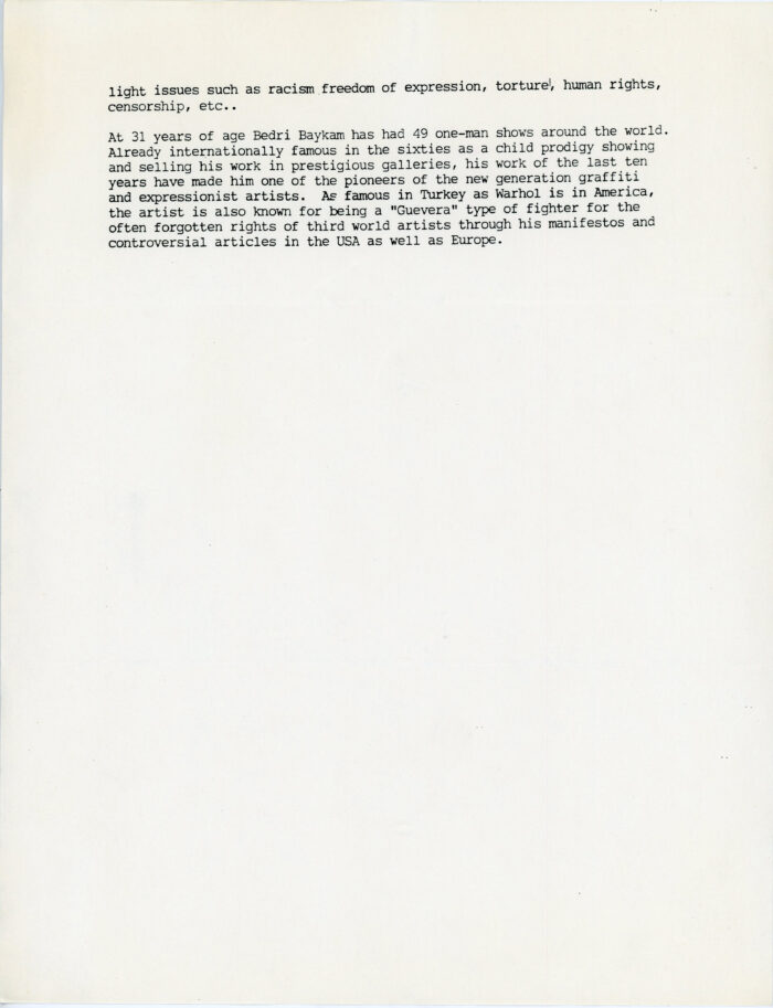 “The Andy Warhol Foundation has moved on with copyrights but they are just too late for Bedri Baykam,” press release and xerox of ad placed by the Warhol Foundation in Art in America.